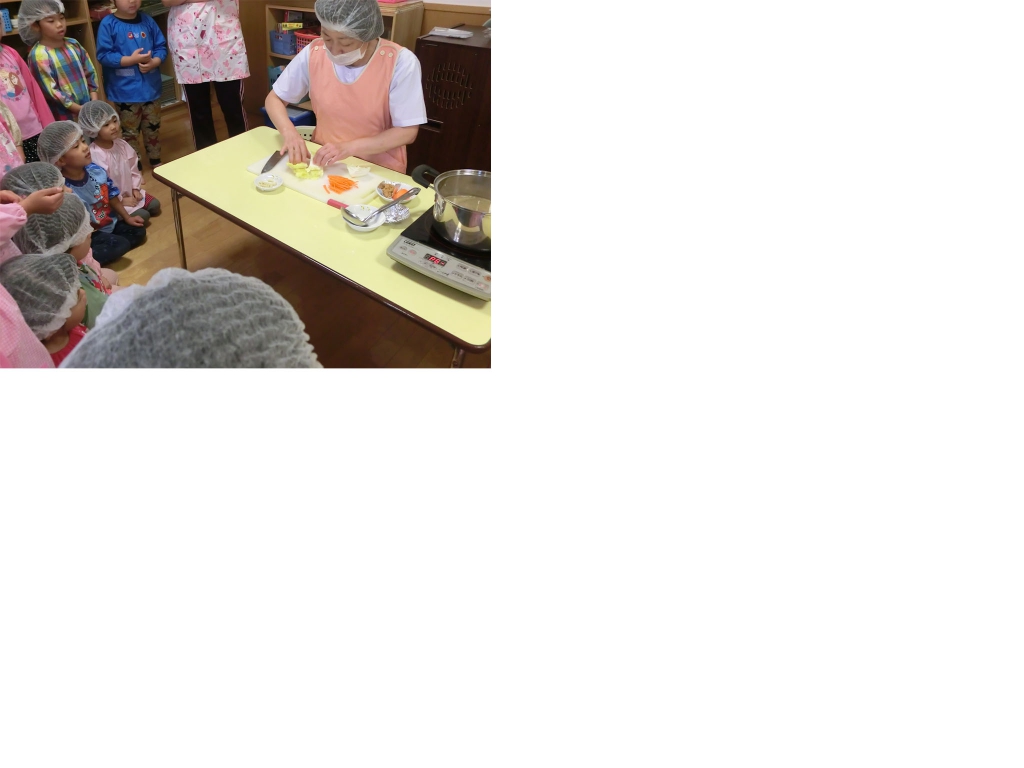 栄養士さんによる 「お味噌汁の作り方」の実演をうさぎ組(4歳児)の子ども達が