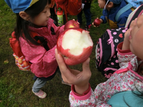 真っ赤に実ったリンゴを、美味しそうにほおばって食べていた子ども達です。