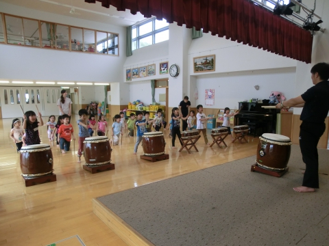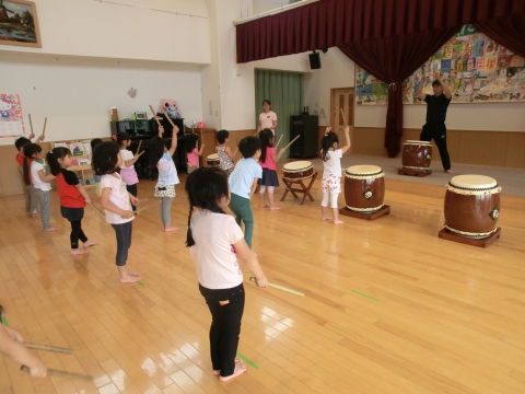 太鼓指導の日・・・・4・5歳児(うさぎ組ときりん組)が太鼓の先生に指導してもらう日でした。