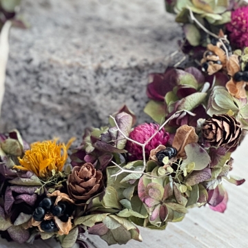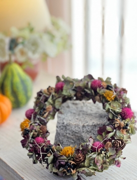 ドライフラワーリースは壁に掛けて、ハロウィンの後もずっと飾って楽しめます。