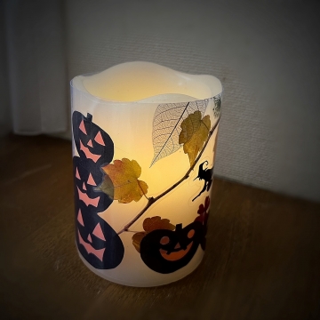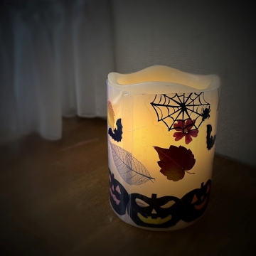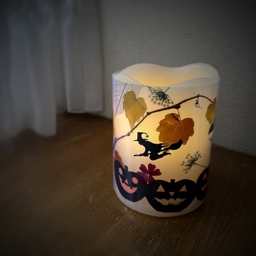 ハロウィンモチーフをちりばめた360°楽しいポップな押し花キャンドル。