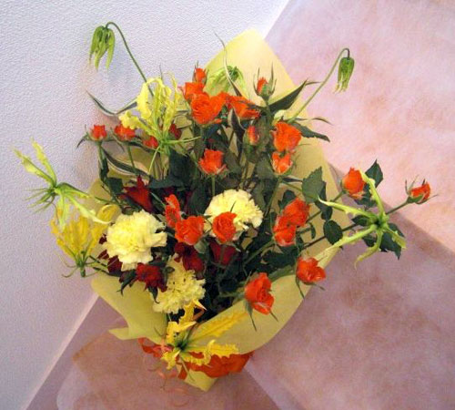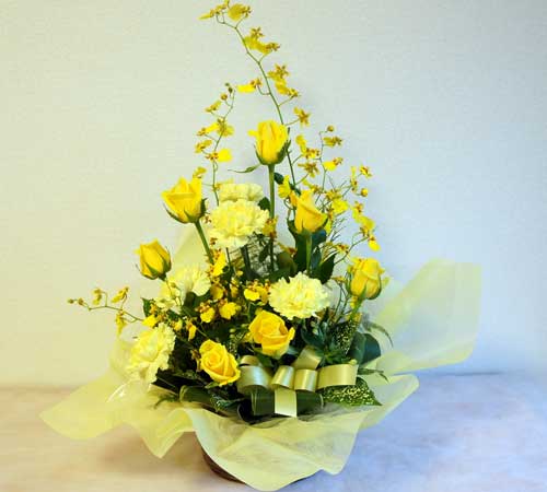 バラ カーネーションを使用したイエロー系の アレンジメントをご用意しております。 江別市内、近郊配達無料。