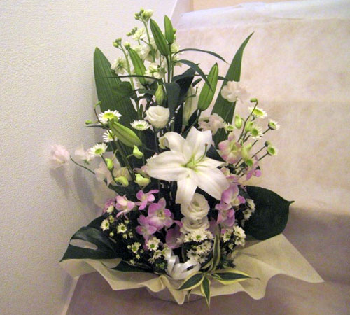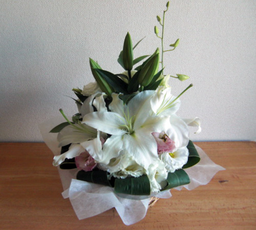 ユリ トルコキキョウを使用した洋風 お供え用アレンジメントをご用意しております。 江別市内、近郊配達無料。