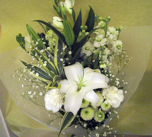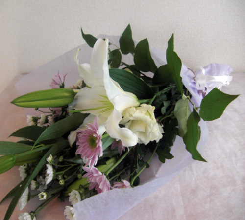 ユリ、スプレー菊を使用したお供え花束をご用意しております。 江別市内、近郊配達無料。