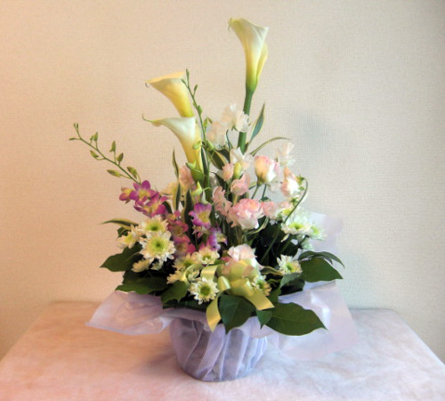 胡蝶蘭、カラー、オンシジュームを使用した お供え用アレンジメントをご用意しております。 江別市内、近郊配達無料。