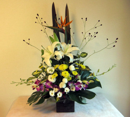 ユリ、オンシジュームを使用した お供え用アレンジメントをご用意しております。 江別市内、近郊配達無料。