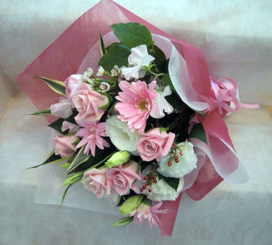 ガーベラ、カーネーション、スイートピーを使用した花束です。 江別市内、近郊配達無料。