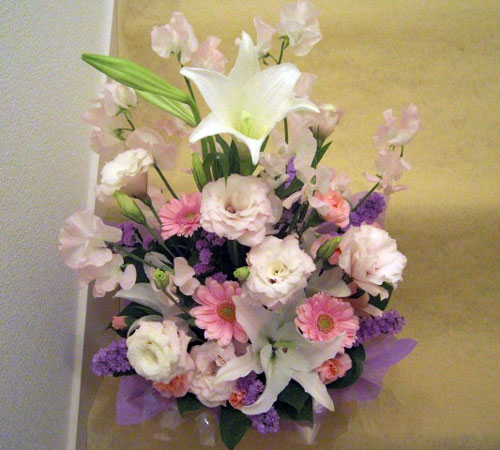 ユリ、ガーベラを使用したお供え用アレンジメントを ご用意しております。 江別市内、近郊配達無料。