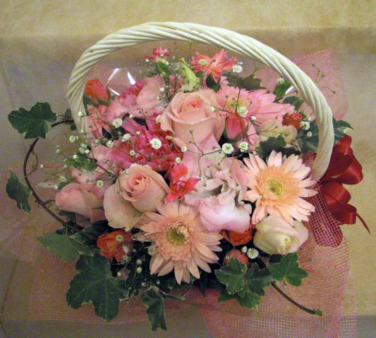 ピンク系のお花を使用した お祝い用アレンジメントをご用意しております。 江別市内、近郊配達無料。