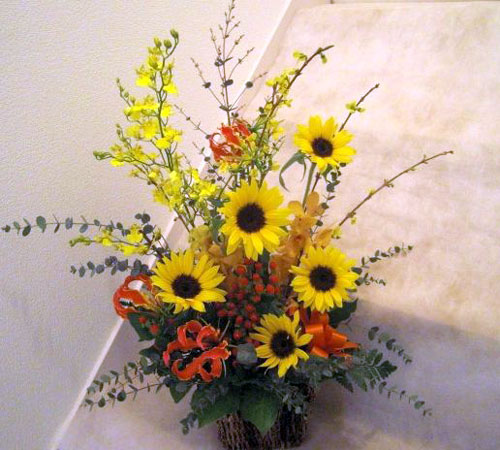 ヒマワリ、オンシジュームを使用した お祝い用アレンジメントをご用意しております。 江別市内、近郊配達無料。