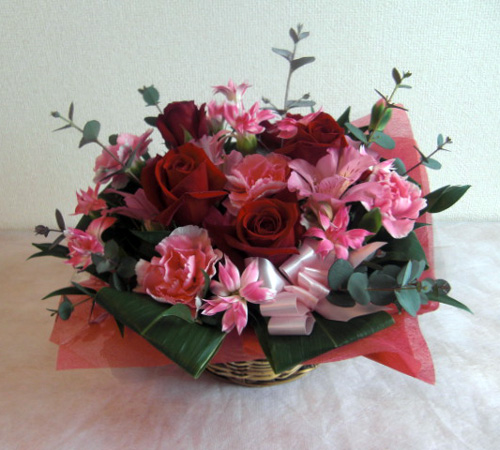 バラ、カーネーションを使用したギフト用アレンジメントをご用意しております。 江別市内、近郊配達無料。